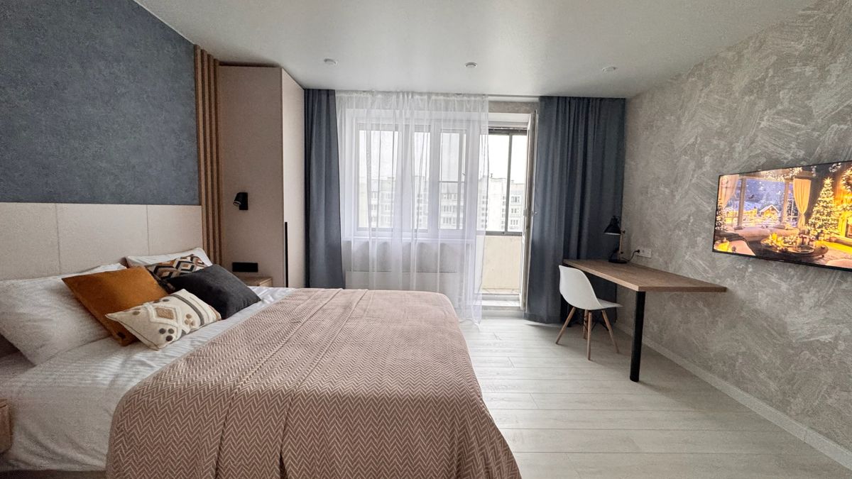 Спальня: двуспальная кровать (160×200), хлопковое белое постельное белье, утюг и гладильная доска, большой вместительный шкаф, рабочий стол, SMART TV