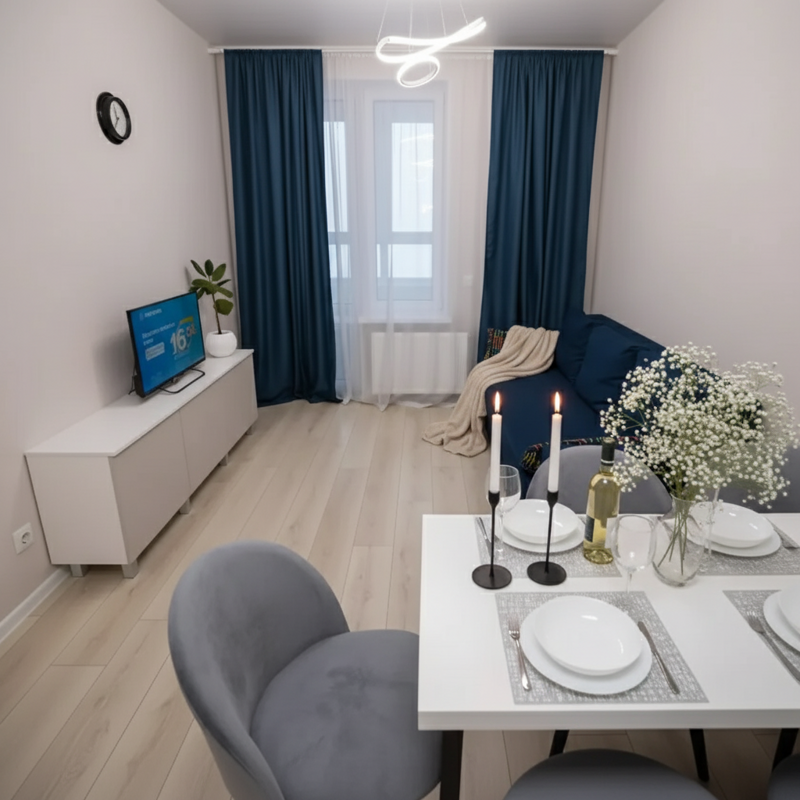 Кухня гостиная и отдельно выделенная спальня. В спальне - супер большая двуспальная кровать, размером 180*200. Матрас - ортопедический, аскона.