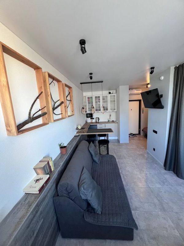 Нежная квартира со спальней, кухней-гостиной и ванной, буквально у большого панорамного окна на 14 этаже, с видом на город.