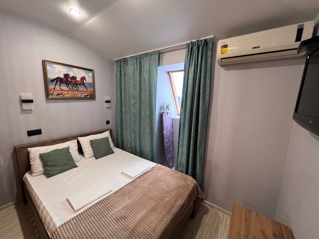 В номере есть все необходимое. В том числе посуда,постельное белье,полотенца,,кондиционер,фен,утюг,микроволновая печь,стиральная машинка и многое другое.Квартира рассчитана на три гостя Есть балкон .И общая терраса ,режим работы общей террасы ограничен .Есть правила посещения .Этаж 4 -й..