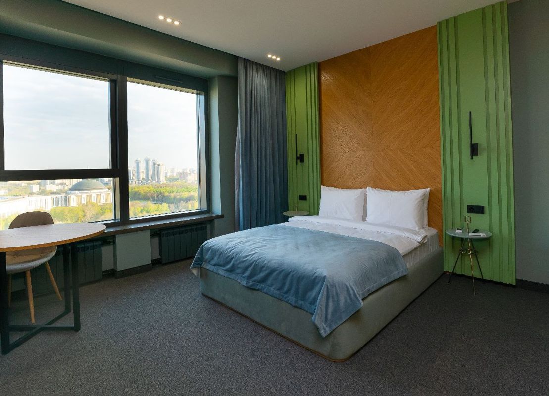 расположенные на 25 этаже ЖК «Матч Поинт». Из панорамных окон открываются восхитительные виды на Парк Победы и Поклонную гору! Просторная студия 37 м² с удобной двуспальной кроватью и качественным ортопедическим матрасом станет идеальным выбором для посуточной аренды апартаментов на Поклонной горе. Эти апартаменты премиум-класса посуточно прекрасно подойдут для размещения двух человек и станут незабываемым местом для романтического свидания или особого торжества.
