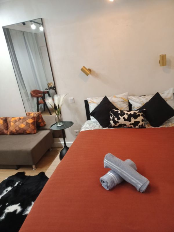 Спальное место - шикарная кровать с ортопедическим матрасом, кухонный гарнитур, плита, холодильник, микроволновка, чайник, посуда, стиральная машина, душ,полотенца, белье и многое другое.
