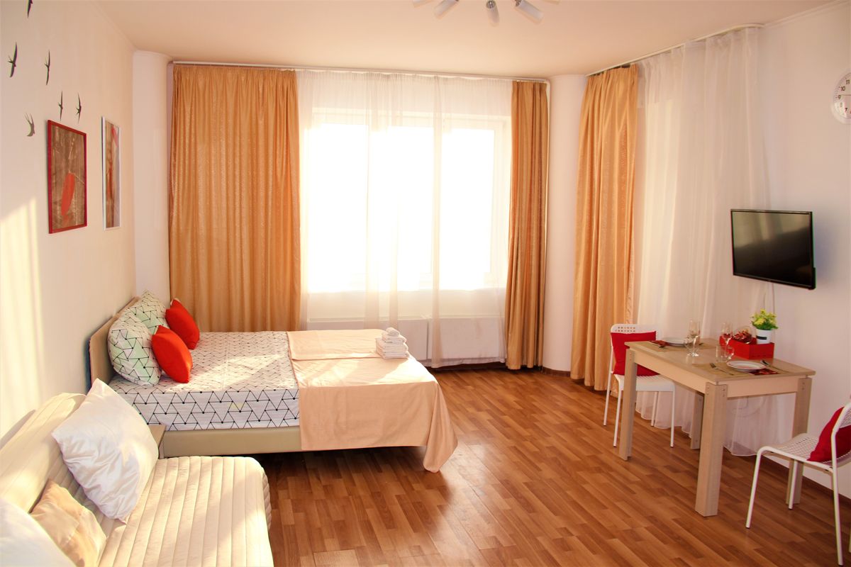 Красивый, современный, 15-этажный жилой дом, квартира со свежим ремонтом, полностью готова для комфортного проживания. Спальных мест до 4х человек, 2+2 кровать и диван.
