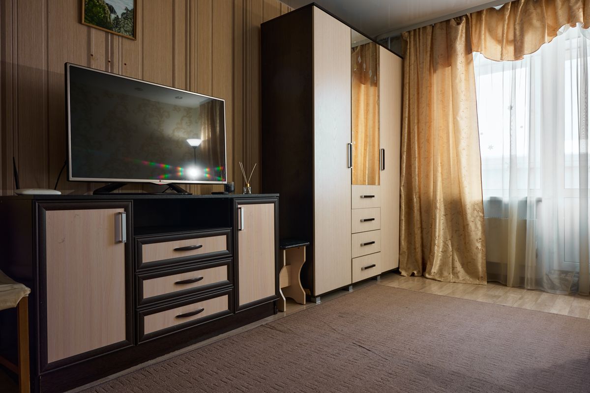 В комнате мягкий раскладной диван,большой телевизор, шкаф с комплектом постельного белья