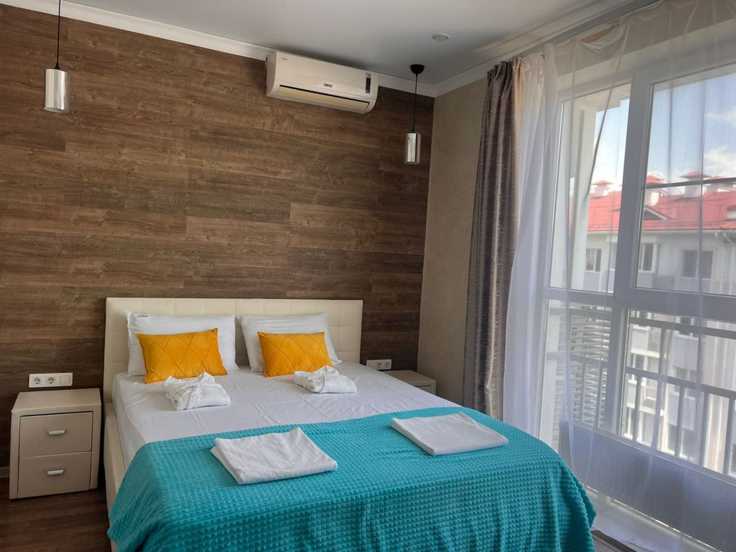 Вид из окон во двор, на детскую площадку и на парковую зону. Планировка в виде студии. Спальные места: двуспальная кровать и диван-кровать. 4 спальных места.