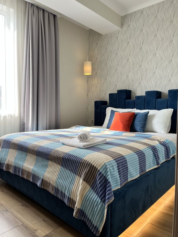 В квартире с дизайнерским интерьером есть отдельная спальня и комната-студия. В квартире есть всё необходимое: от кухонной утвари до посудомоечной машины. В спальне установлена кровать размером 180х200 см с ортопедическим матрасом. Комната-студия оборудована раскладным диваном и телевизором. Апартаменты расположены в доме с закрытым двором.