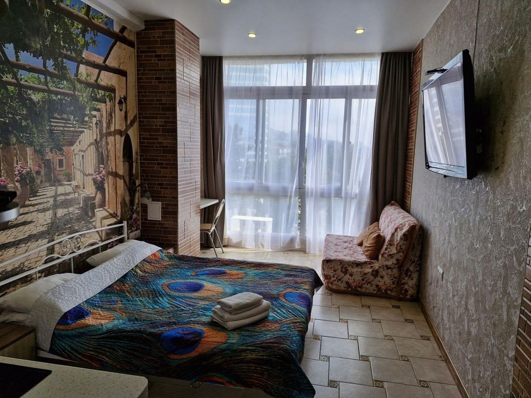Апартаменты с панорамным окном и видом на море. В квартире: двуспальная кровать, диван-кровать, кондиционер, кухня, микроволновая печь, чайник, ТВ, Wi-Fi, сан.узел, душ, стиральная машинка.