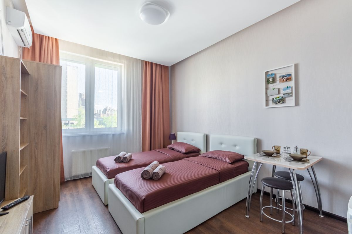 Уютные дизайнерские апартаменты АПАРТОНИКА c двумя односпальными кроватями, со своей кухней, санузлом, стиральной машиной.