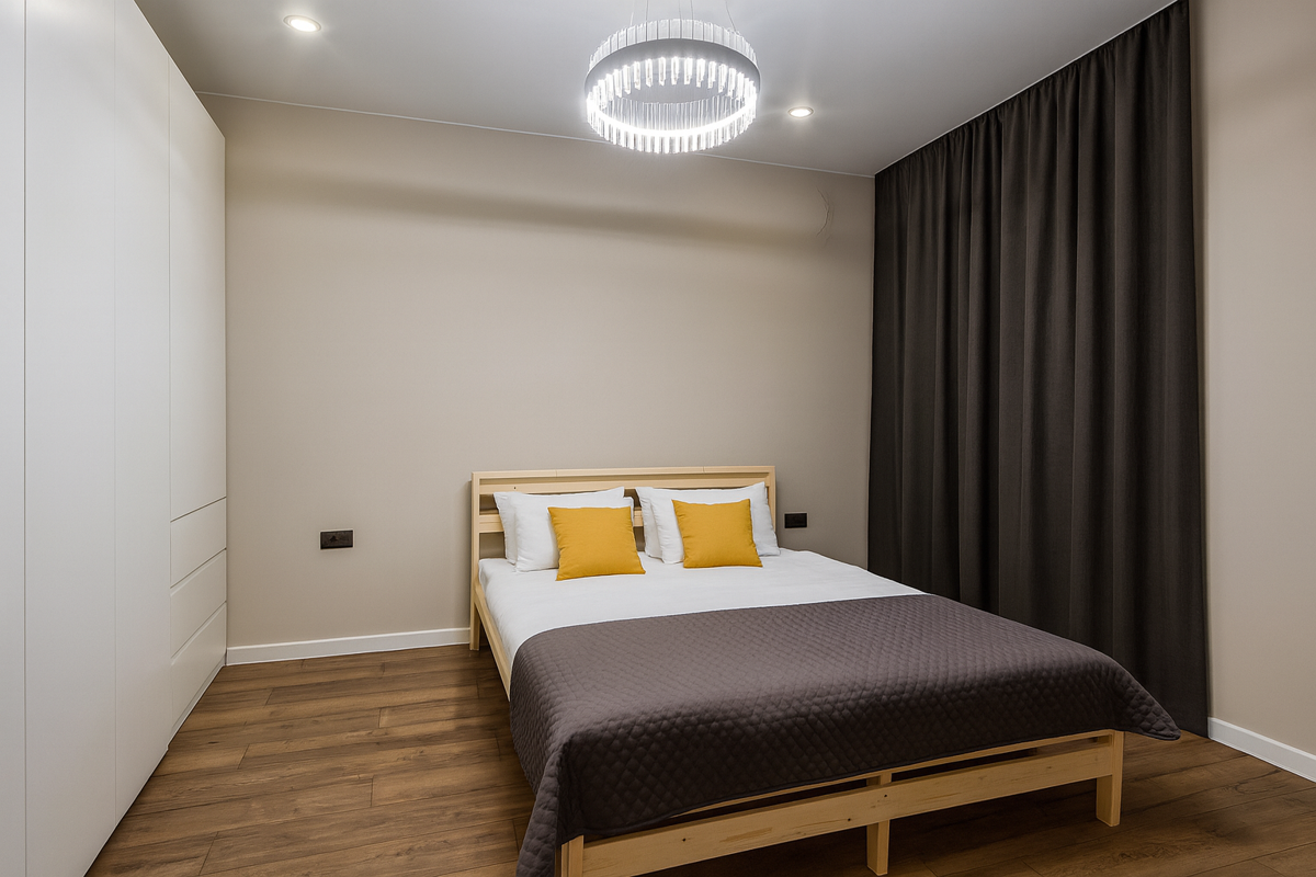 — Просторная спальня с кроватью, ортопедическим матрасом и свежим бельём