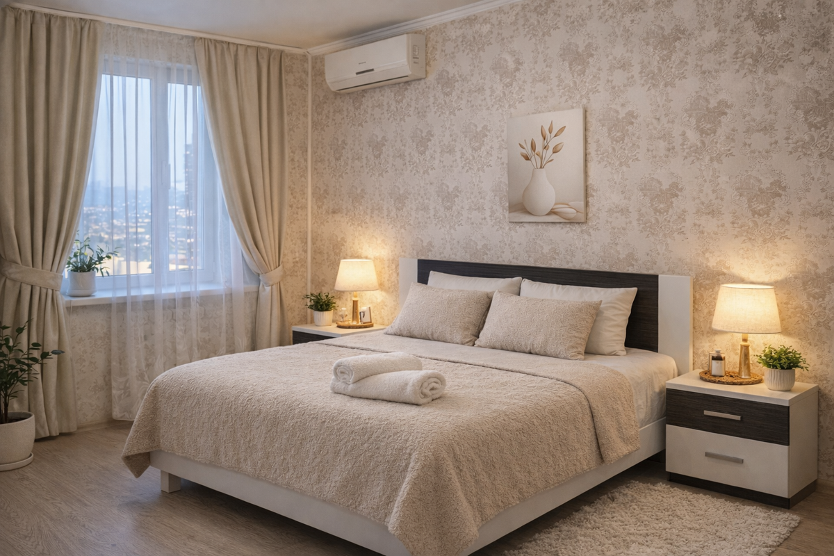 Одно из главных преимуществ объекта — сочетание домашнего уюта и городской доступности. Эта квартира выгодно отличается тем, что вы получаете не просто адрес для ночёвки, а полноценное пространство для отдыха и повседневной жизни: отдельные комнаты, удобную кухонную зону, продуманную бытовую часть, спокойную атмосферу, нормальное хранение вещей и эстетичный интерьер. Многие объекты посуточной аренды уступают именно в бытовых деталях: где-то не хватает удобной кухни, где-то мало места для хранения, где-то только один кондиционер или нет ощущения завершённого жилого пространства. Здесь же акцент сделан на реальный комфорт: можно отдыхать, работать, готовить, стирать вещи, спокойно разместить одежду и личные предметы, не перегружая комнату сумками и пакетами. Квартира особенно удобна для гостей, которым важно, чтобы всё было “по-человечески”: чисто, спокойно, функционально и без лишнего пафоса.