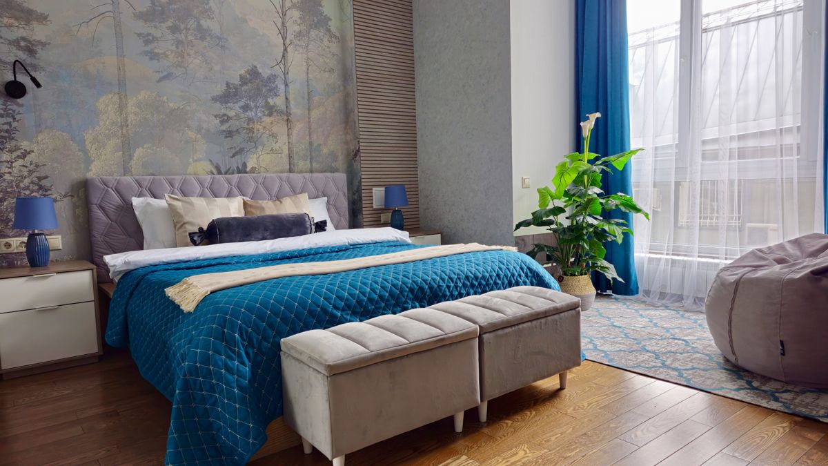 • ✅ Просторная спальня с элегантной двуспальной кроватью (160 см), заправленной чистым бельем из прачечной, и уютным диваном-кроватью.