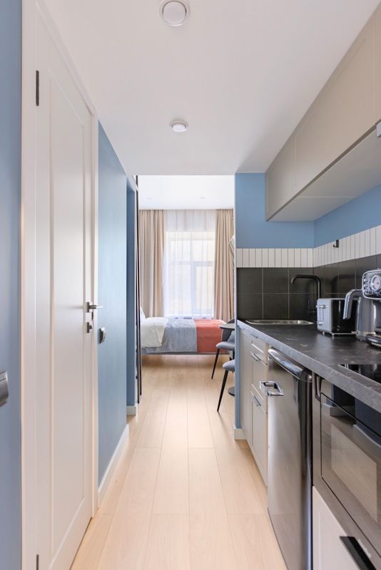- Холодильник, микроволновая печь, индукционная плита, чайник, тостер, вся необходимая для приготовления и приёма пищи посуда;