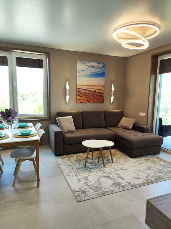 Новая комфортабельная 2-х комнатная квартира с кухней - гостиной, отдельной спальней, гостевой комнатой в новом доме с дизайнерским ремонтом и видом на море из всех окон. Квартира полностью меблирована и оснащена всей необходимой для отдыха техникой. Открытый балкон с видом на море.