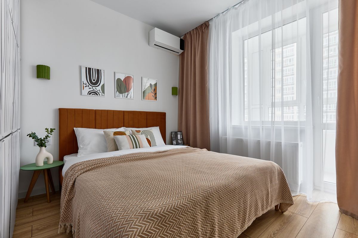 - Спальная зона: кровать 160×200 с ортопедическим матрасом, smart-телевизор, сплит-система, затемняющие шторы блэкаут. Дополнительно: диван-кровать 140×200.