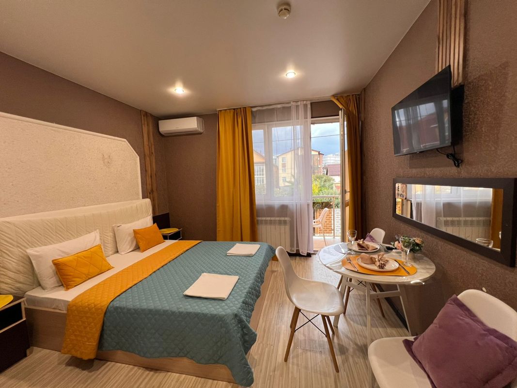 В номере есть все необходимое. В том числе посуда,постельное белье,полотенца,,кондиционер,фен,утюг,микроволновая печь,стиральная машинка и многое другое.Квартира рассчитана на три гостя Есть балкон .И общая терраса ,режим работы общей террасы ограничен .Есть правила посещения .Этаж 2 -й..