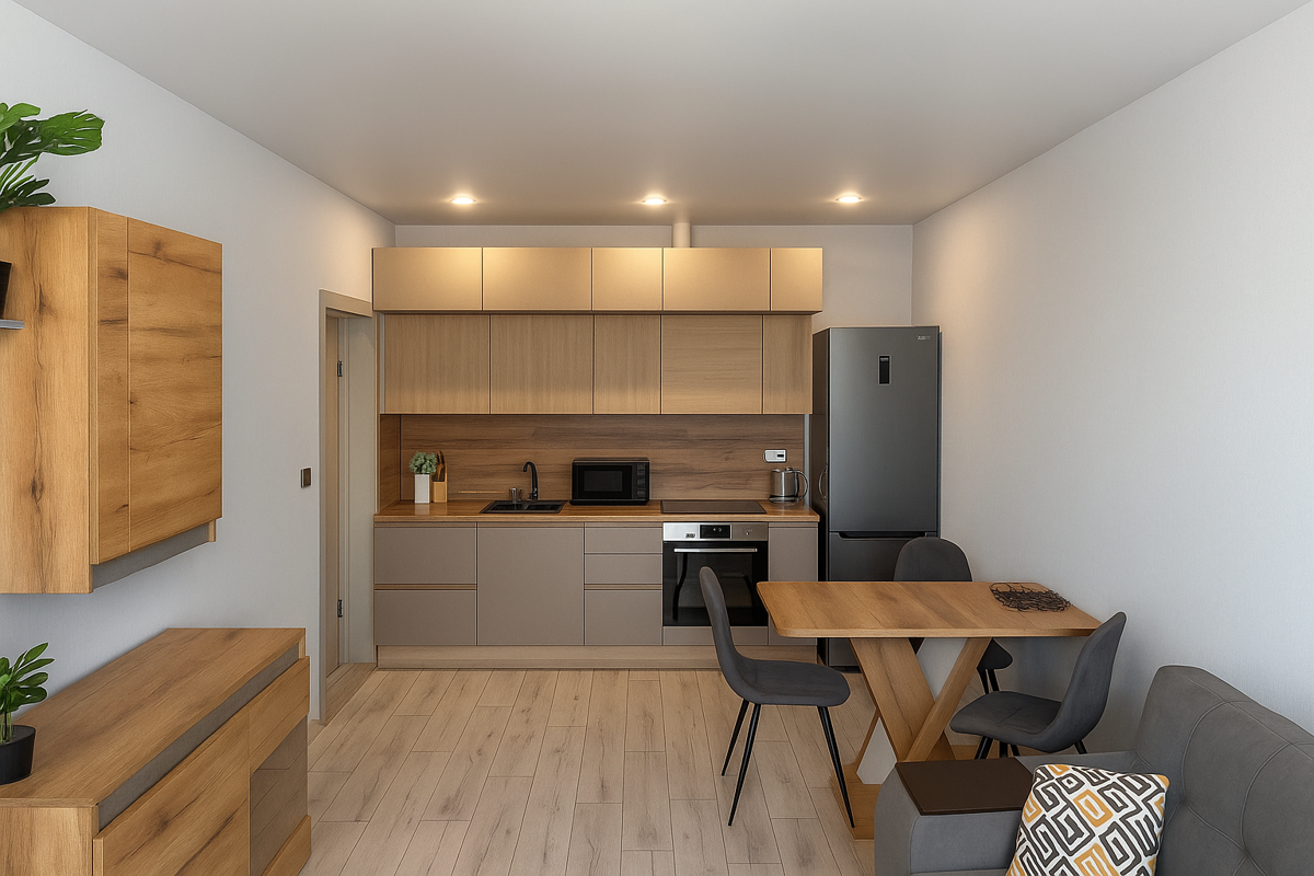 🍽️ Кухня оборудована: Холодильником, Варочной панелью, Микроволновой печью, Чайником, а также посудой и столовыми приборами.