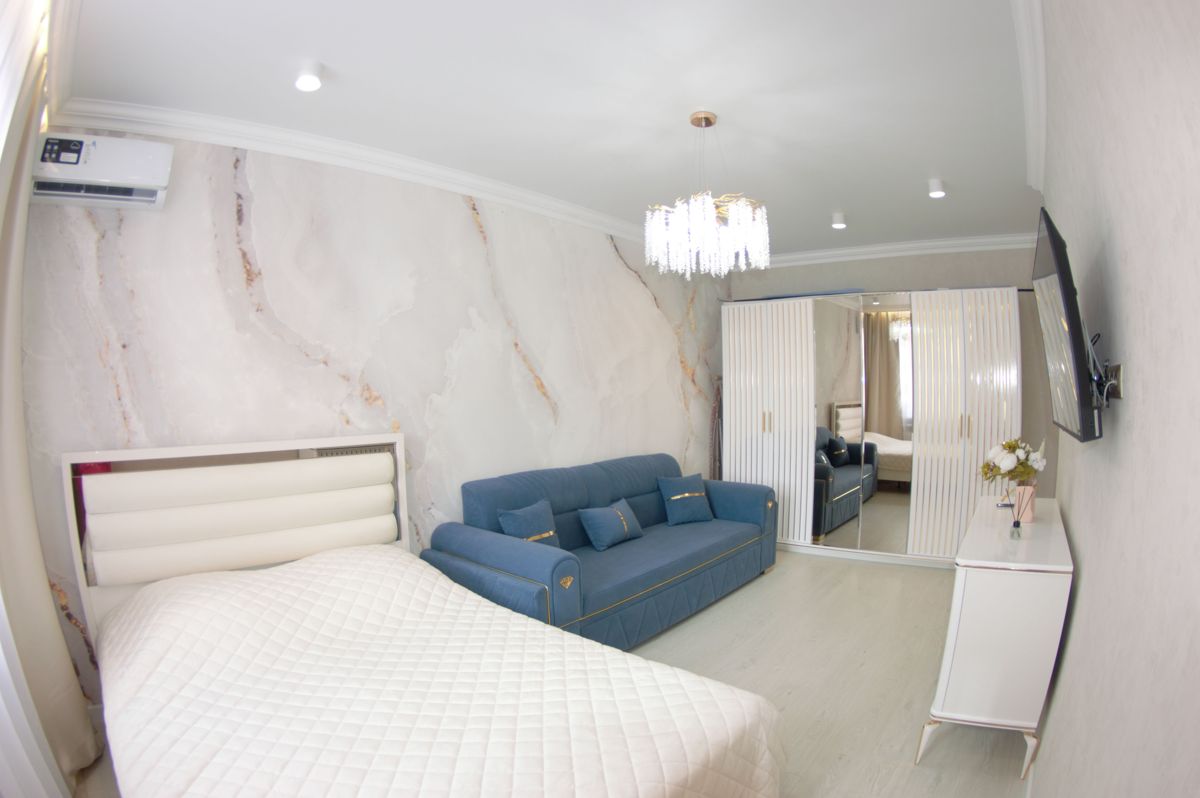 Квартира состоит из двух уютных спален и просторной кухни-гостиной. Спальни оборудованы кроватями с ортопедическими матрасами, а также удобными диванами с раскладным механизмом дельфин, что создает комфортную атмосферу для отдыха и просмотра фильмов. В комнатах предусмотрены журнальные столики для чаепитий и общения.
