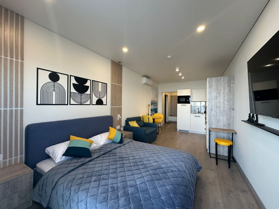 Уютный, в оливковых оттенках апартамент выполнен в стильной контрастной цветовой гамме, отражающей эмоции летних дней, проведенных в нашем курортном городке.
