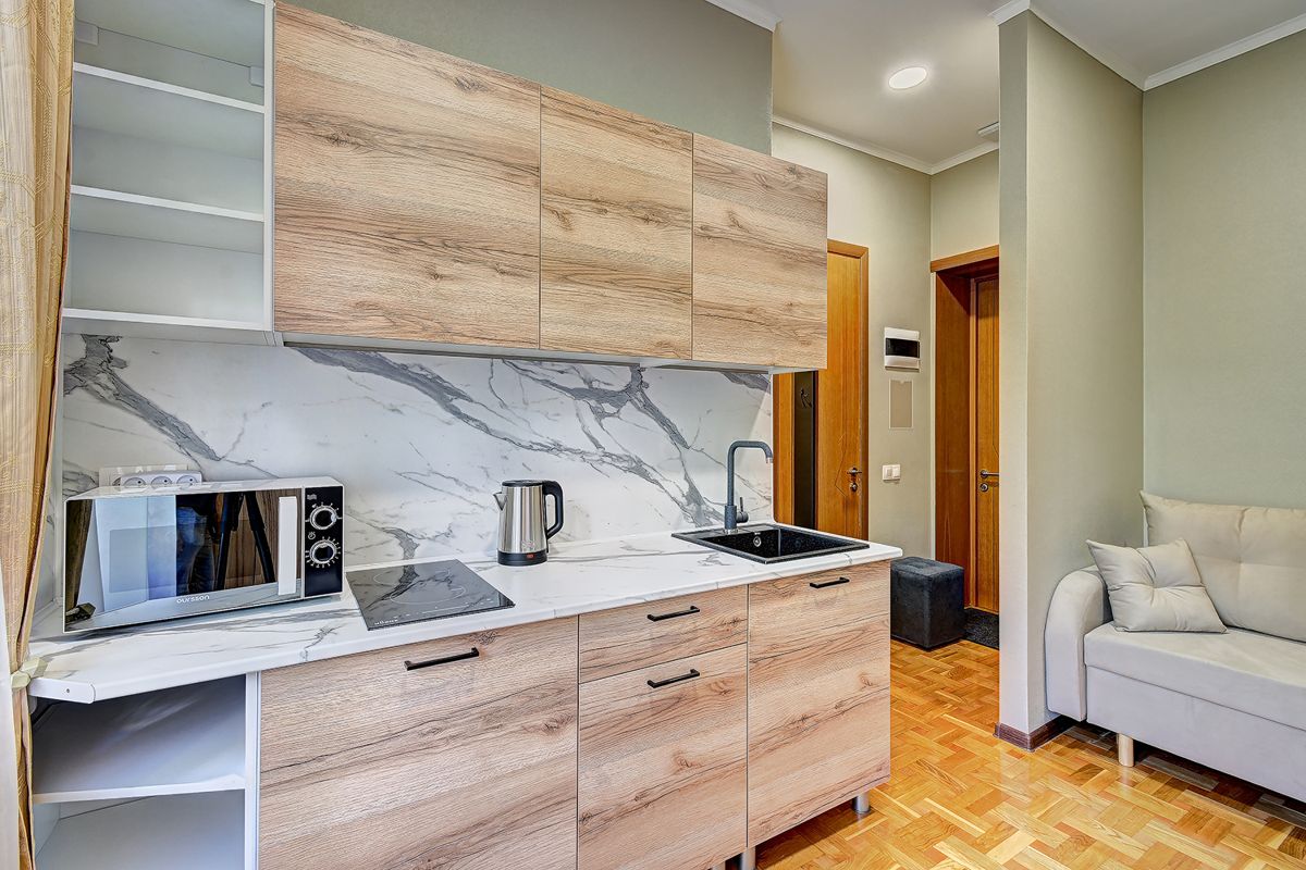 На кухне имеется посуда и техника для приготовления. В каждой квартире есть стиральная машинка и кондиционер.
