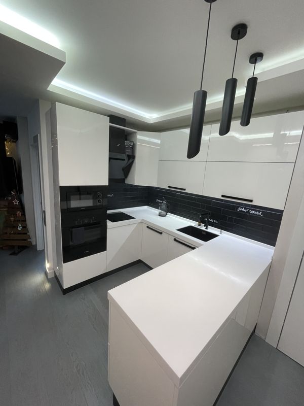 Кухня со всем необходимым оборудованием (микроволновая печь, духовой шкаф, вытяжка, варочная панель, посудомоечная машина, стиральная машина).