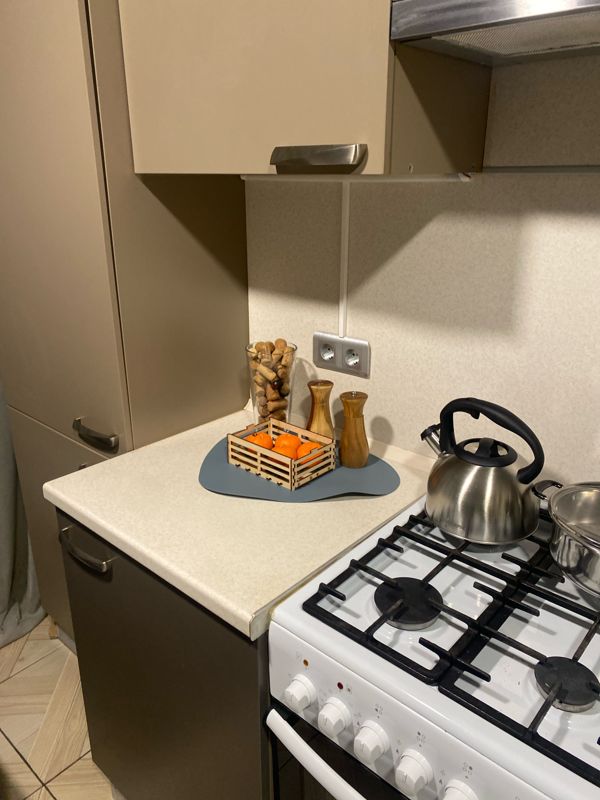 Оборудованная кухня со всей необходимой техникой: холодильник, газовая плита, микроволновая печь, чайник. Предусмотрена вся необходимая посуда: плоские тарелки, глубокие тарелки, кружки, бокалы, вилки, ложки, столовые ножи, чайные ложки, кастрюля, сковородка, разделочная доска