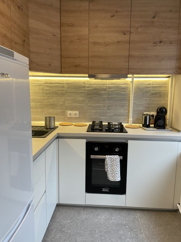 Квартира - на втором этаже. Кухня оснащена всем необходимым в том числе духовкой, микроволновой печью, кофемашиной Dolce Gusto, набором посуды для приготовления и приема пищи.