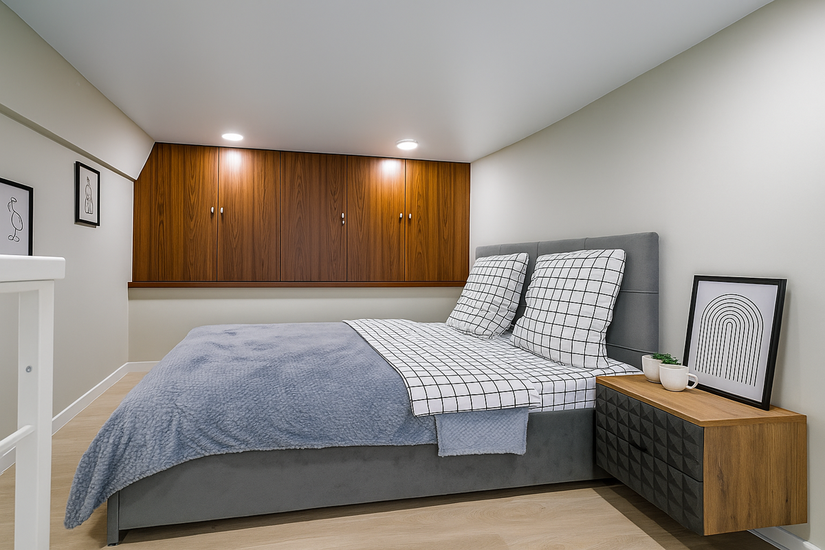 — Спальные места: двуспальная кровать с ортопедическим матрасом и раскладной диван