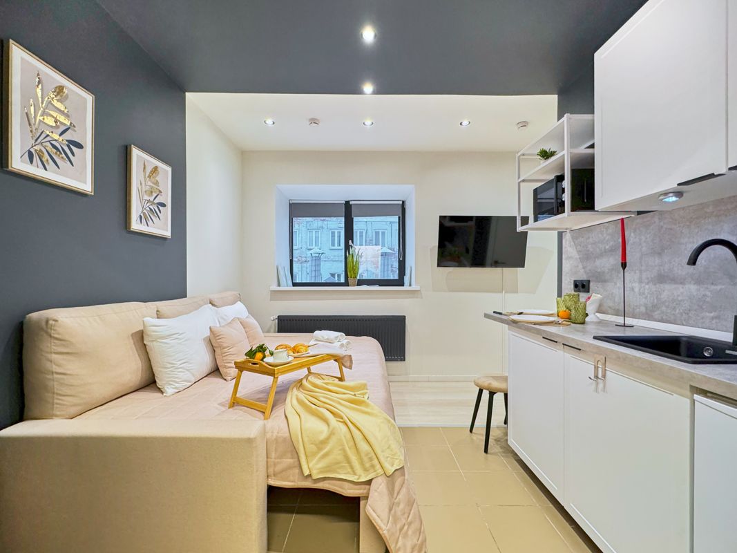 Чудесная студия с правильной эргономикой и с кофе - в постель:). 3 спальных места.