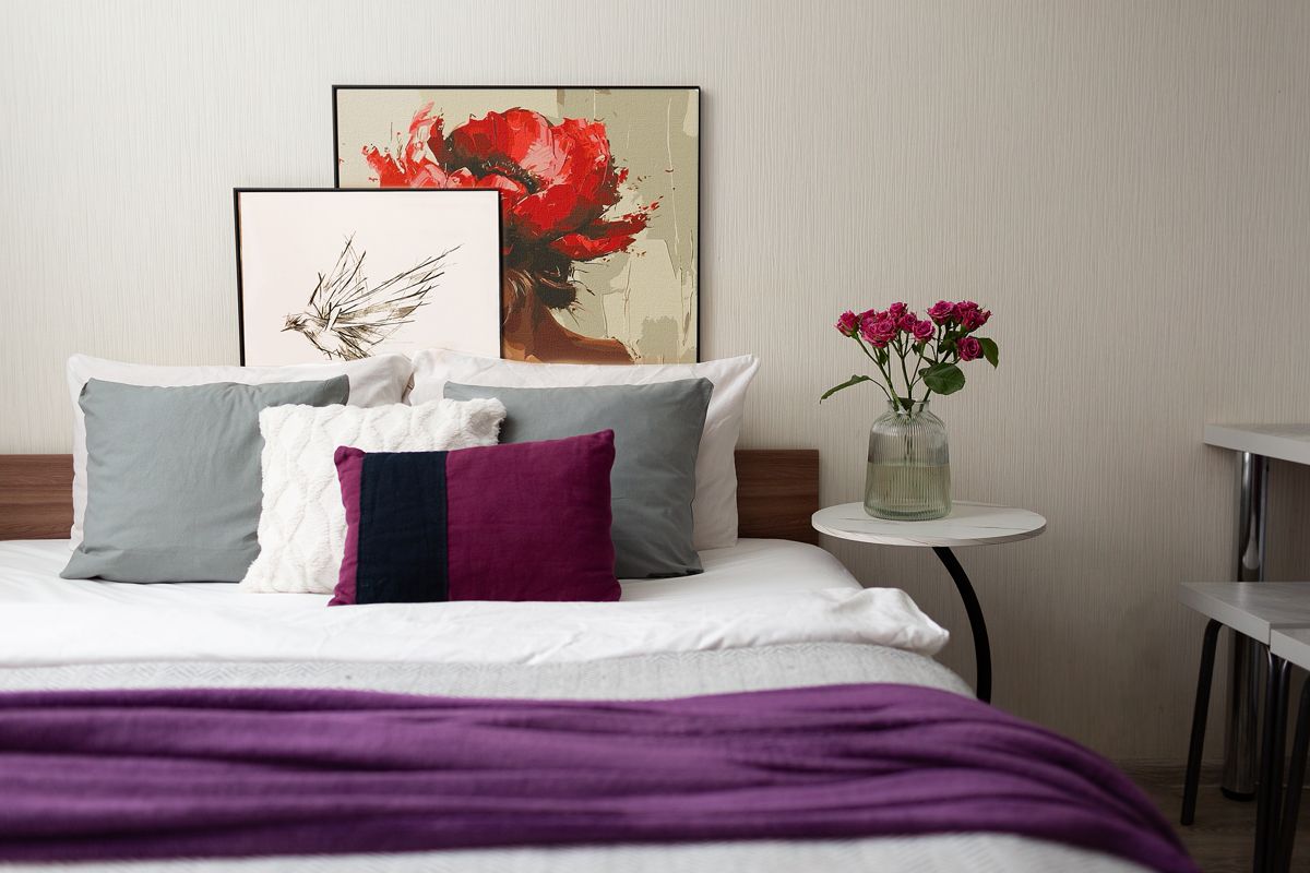* Широкая двуспальная кровать с чистым белым постельным бельем для крепкого сна.