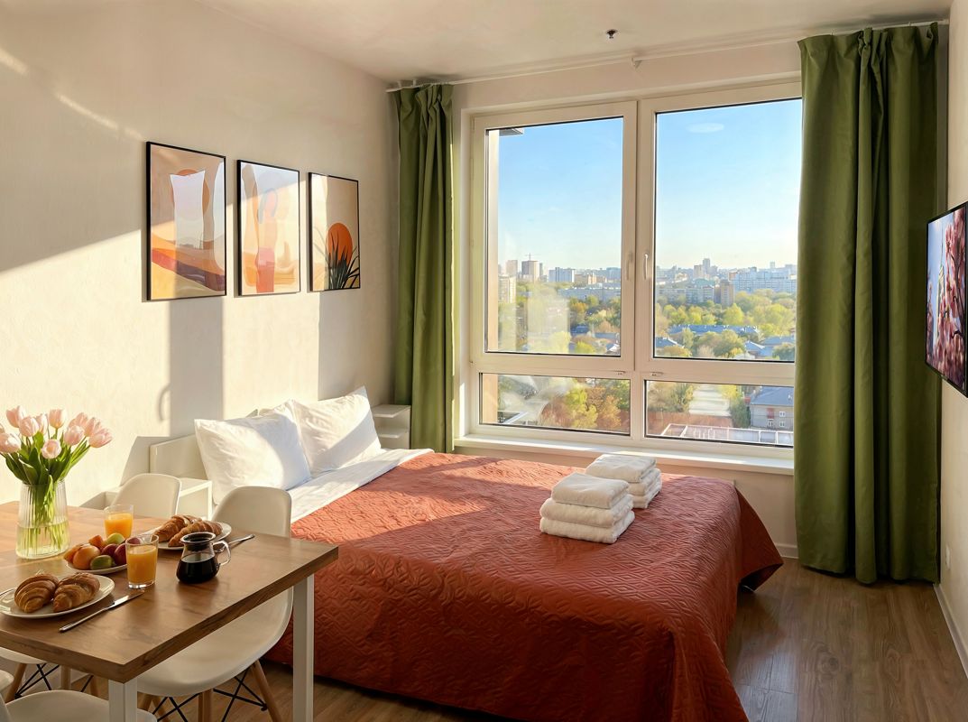 В студии новый ремонт, новая бытовая техника. Есть полноценная кухонная зона с необходимой техникой и посудой. При заезде вас будет ждать 2-х местная кровать с ортопедическим матрасом, свежее чистое белье и полотенца и приветственный гигиенический набор (одноразовые гель , мыло, туалетная бумага на первый день проживания).