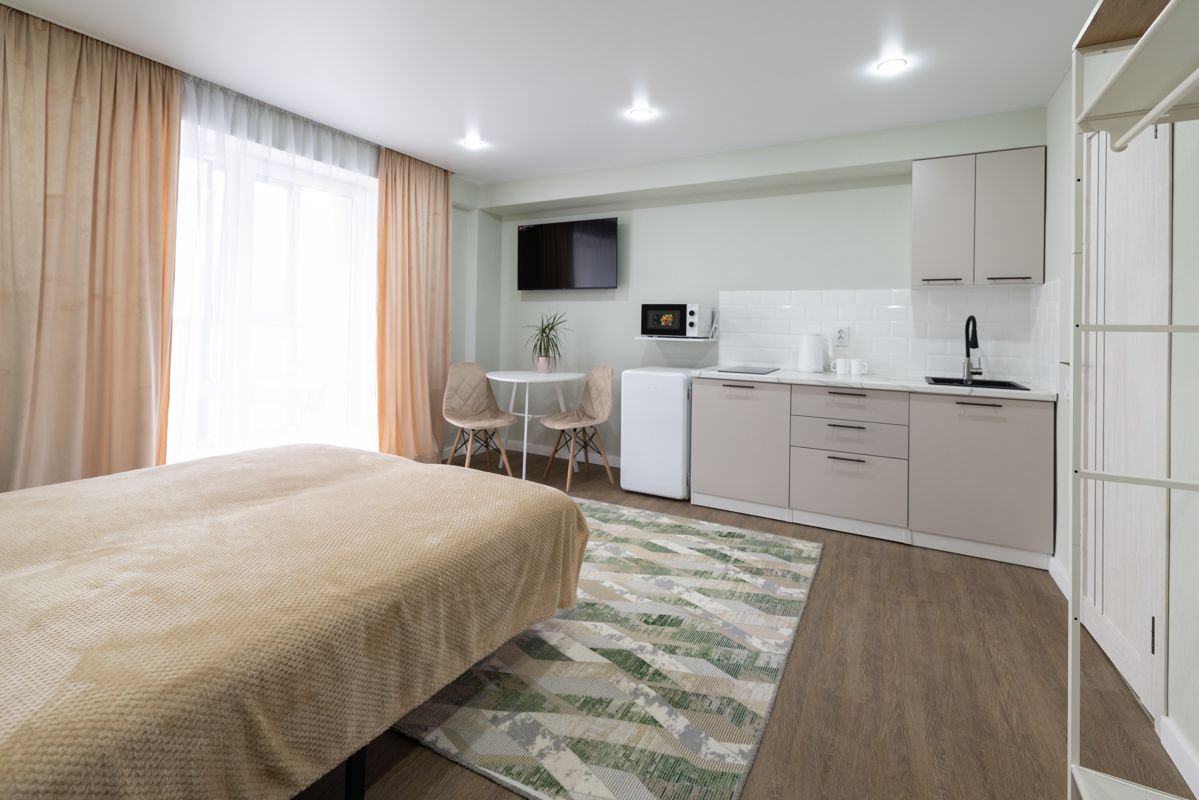 Премиум видовой номер с видовым балконом в бежевых тонах. Зона прихожей. Удобная ванна, широкая двуспальная кровать с высоким изголовьем, кухонный уголок, полностью оборудованный холодильником, свч печью, чайником. Есть уютный круглый столик для завтрака, где комфортно разместится два человека.