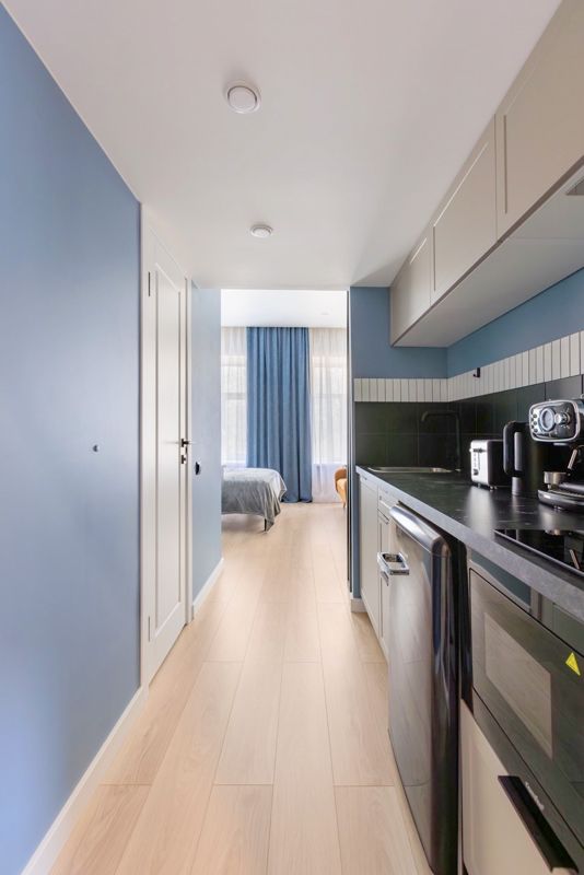 - Холодильник, микроволновая печь, индукционная плита, чайник, тостер, вся необходимая для приготовления и приёма пищи посуда;