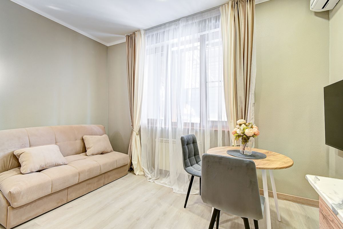 Апартаменты студия с диваном 16кв м с кухней. Есть все необходимое для посуточного и длительного проживания. Кухня с плитой, чайником, микроволновой печью, холодильником, посудой. В санузле душевая кабина, раковина, унитаз, фен, стиральная машинка. Тапочки и халаты можно приобрести отдельно