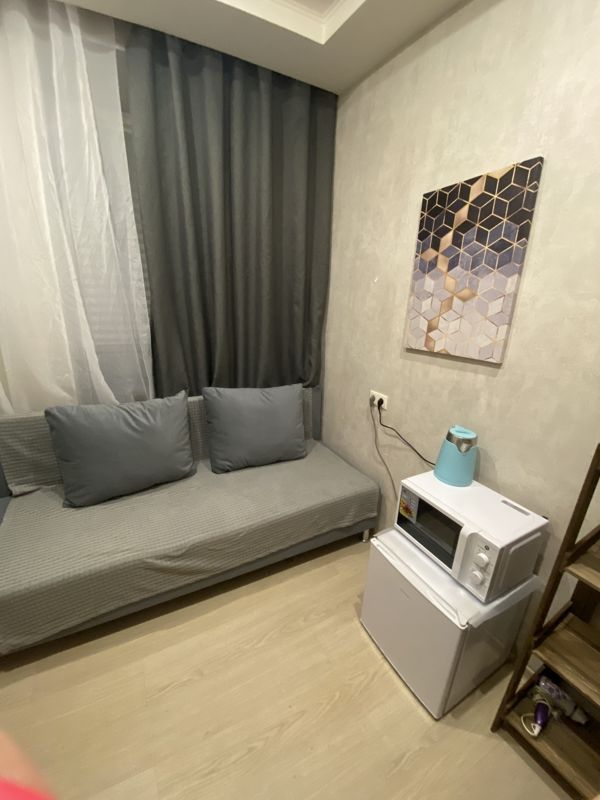 В комнате есть двуспальный диван, шкаф, холодильник, микроволновая печь, чайник, посуда. По запросу предоставим мультиварку, в числе удобств: фен и Wi-fi. Мы предоставляем постельное белье и комплект полотенец для каждого гостя, также студия укомплектована бесплатными туалетно-косметическими принадлежностями, в том числе, шампунь, мыло, гель для душа Synergetic и прочее.