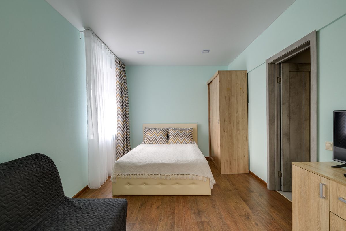 Современная мебель, двуспальная кровать, бытовая техника, скоростной WI-FI, спутниковое TV, гладильная доска, сушилка для белья, фен, оборудованная кухня, полный комплект посуды для приготовления и приёма еды