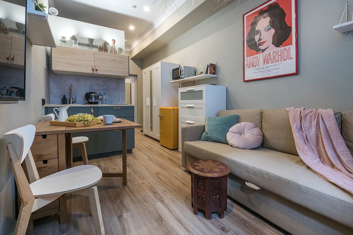 В студии есть удобный раскладной диван и полностью оборудованная кухня, посуда, просторная душевая, душевые принадлежности, стиральная машина, фен, утюг.