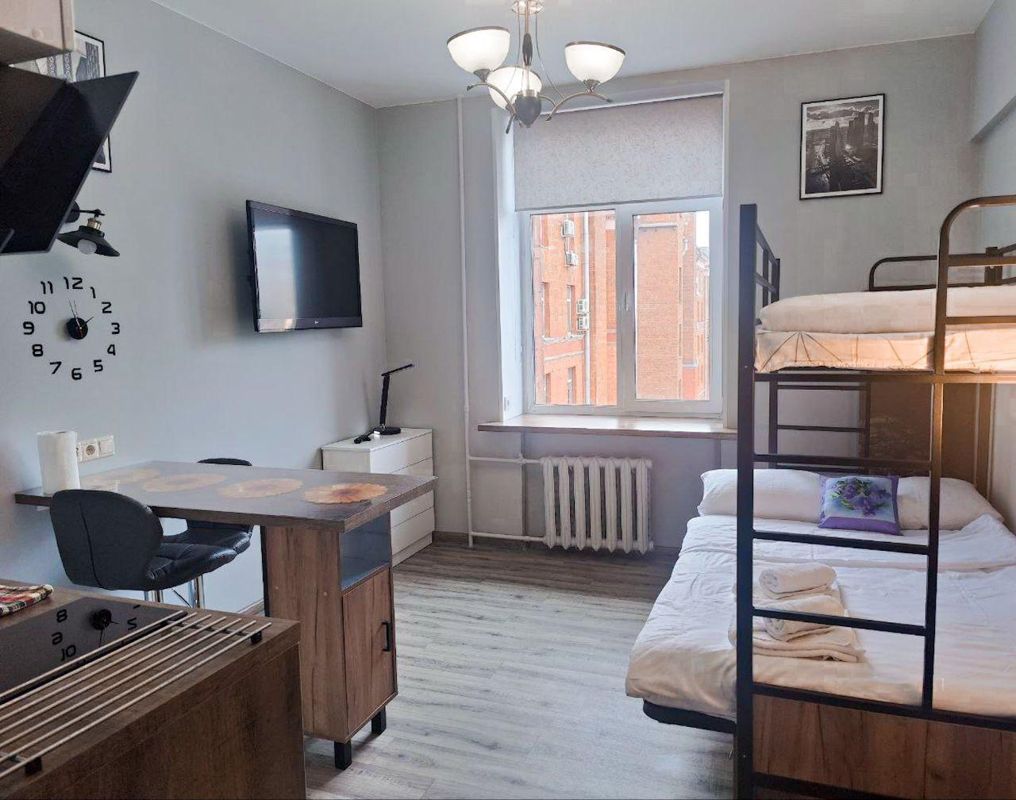 Уютные апартаменты с большой кроватью в стиле лофт. Оборудованная кухонная зона: чайник, СВЧ, варочная панель, посуда, сторловые приборы, бокалы для вина. В санузле: душ, белые полотенца на каждого гостя по 2 шт, полотенце для ног в душевой. Чистое белое пастельное белье из прачечной! Вид из окон-во двор. Станция метро напротив дома!