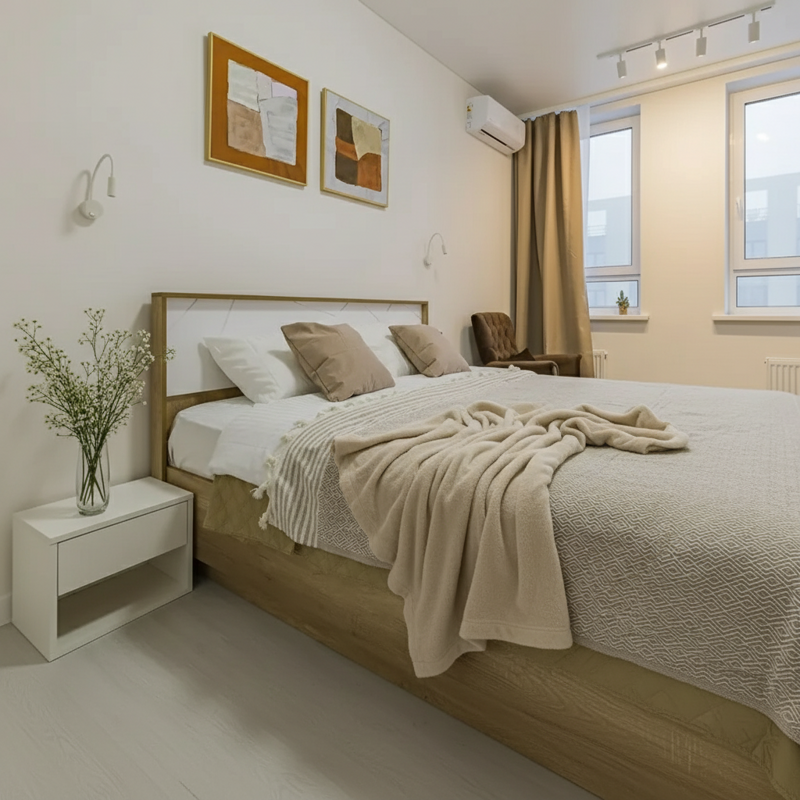 Два кондиционера: в каждой из комнат, холодильник, 2 смарт телевизора, Wi-Fi, стиральная машина, фен, шкаф для одежды, гардеробная, гладильная доска , утюг, пылесос.