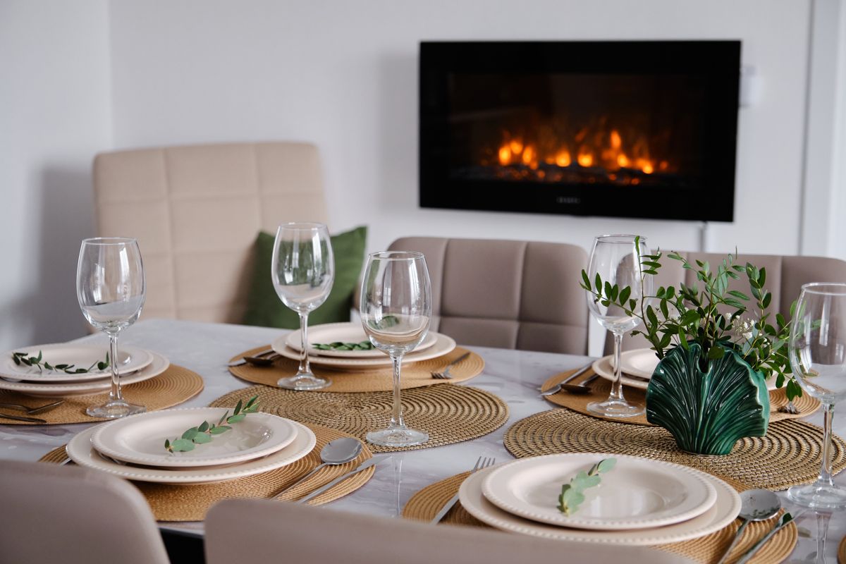 • вся необходимая посуда: красивый комплект тарелок, столовые приборы, кастрюли, сковородки, салатники, кружки, бокалы и прочее,