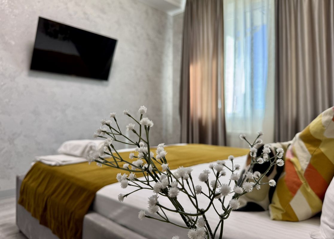 Интерьер выполнен в современном стиле с качественной отделкой. Просторная спальня оборудована удобной кроватью и телевизором с кабельным/цифровым ТВ.