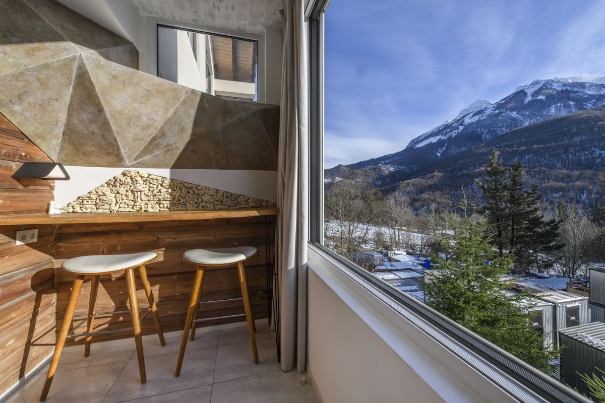 Уникальная студия с авторским дизайном и душой в каждой детали. Здесь вы встретите — только натуральное дерево, камень и премиальная отделка, создающие ощущение настоящего горного уюта. Главная магия — чувственная ванна у панорамного окна на двоих. Представьте: тёплая вода, бокал игристого и закат, окрашивающий вершины в золото. А 5-метровое окно во всю стену дарит ощущение, что вы парите над горами прямо из кровати.
