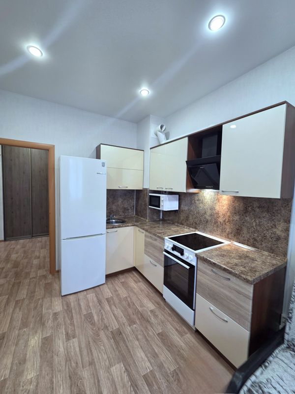 В наличии посуда для приготовления пищи, бытовая техника ( чайник, варочная панель, микроволновая печь, холодильник)