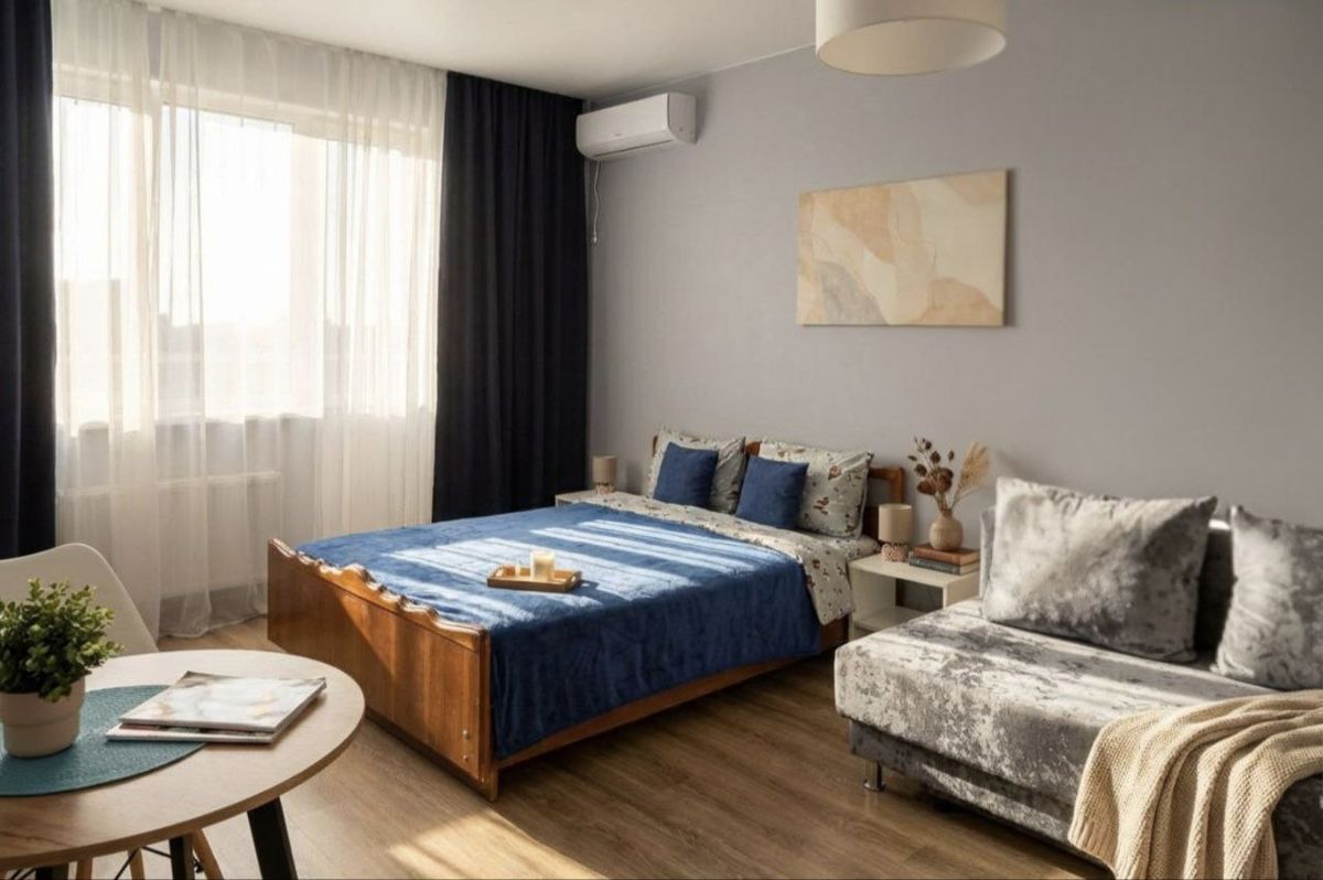 Уютная гостиная с двуспальной кроватью, свежим постельным бельем и спокойной обстановкой. Ванная комната с совмещенным санузлом оснащена полотенцами и необходимыми средствами гигиены.