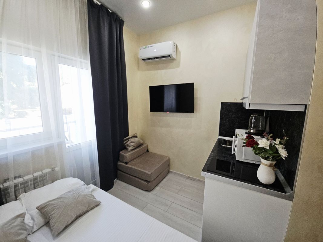 Студио с балконом находится в апарт-отеле. В проживание включено пользование круглогодичным подогреваемым бассейном, сауной, детской площадкой, тренажерами. Территория отеля полностью огорожена без допуска посторонних. В нашем здании есть столовая.