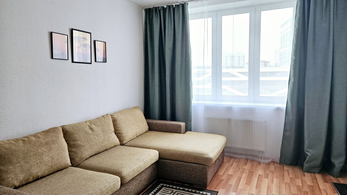 Большая гостевая комната с кухонной зоной. Отдельная спальная комната с выходом на лоджию. В гостевой комнате большой угловой диван 220*200, обеденный стул со стульями, телевизор smartTV, в спальне двуспальная кровать и плательный шкаф. Предоставляем постельное белье на каждое спальное место, полотенца из расчета на 4 человека. В доме 2 лифта (грузовой, пассажирский). Во дворе большая детская площадка.