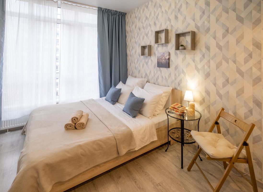 ✔️ СТУДИЯ: 1 комната, 1 двуспальная кровать + 1 раскладной диван. Для вас готово свежее постельное бельё (100%-й хлопок) и полотенца. В квартире есть душевая кабина. На этаже — балкон.