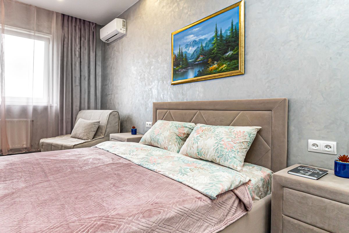 Двуспальная кровать, кресло-кровать в комнате и диван раскладной на кухне-гостинной. Размещение 5-х человек (2+2+1).