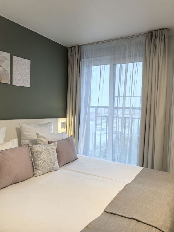 Апартаменты оборудованы всем необходимым: современной бытовой техникой, включая телевизор, чайник, кофе-машину, стиральную и посудомоечную машины, фен, утюг, сейф и варочную панель. В спальне предлагается двуспальная кровать или две односпальные кровати - выбор за гостем.