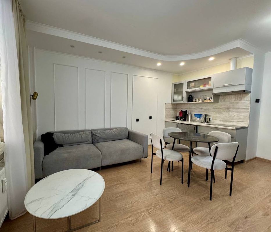 Уютная квартира студия , полностью меблированная, расположена в новом доме. Двуспальная кровать и диван. Чистое постельное бельё, полотенца, питьевая вода, сахар, чай, одноразовый гель и шампунь предоставляются бесплатно.