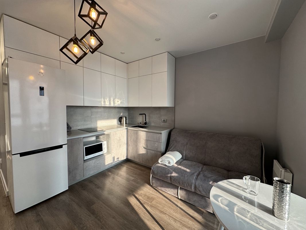 Квартира выполнена в современном стиле: спокойные серые стены, белая мебель, аккуратный свежий ремонт. Есть отдельная гардеробная для удобного хранения вещей.